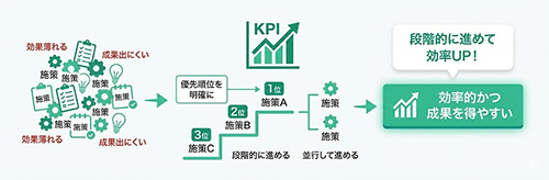 並行して進めても支障のない施策もありますが、それ以外は優先順位をつけ、段階的に進めると効率的かつ成果を得やすいでしょう。