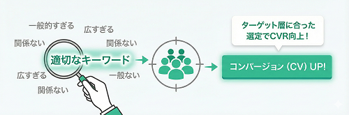 成果を高めたいなら、コンバージョン対象となる商品やサービスをより明確に定義した上で、関連性の高い具体的なキーワードを選びましょう。また、キーワードの見直しと同時に、広告文やWebサイトのコンテンツ内容もターゲットユーザーに最適化することで、来てほしい人を集客しやすくなり、コンバージョン増加につながる効果が期待できます。