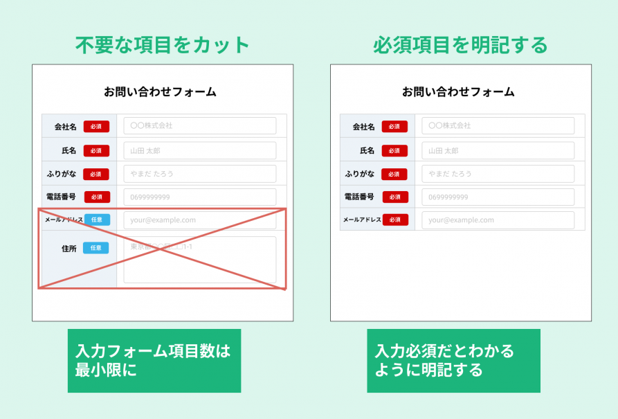 入力フォームの改善もコンバージョンを増やすためには欠かせない取り組みです。項目数が多いフォームはユーザーの負担となり、入力途中で離脱しやすくなります。そのため、フォームは必要最低限の情報だけを入力してもらうシンプルな構成が理想的です。