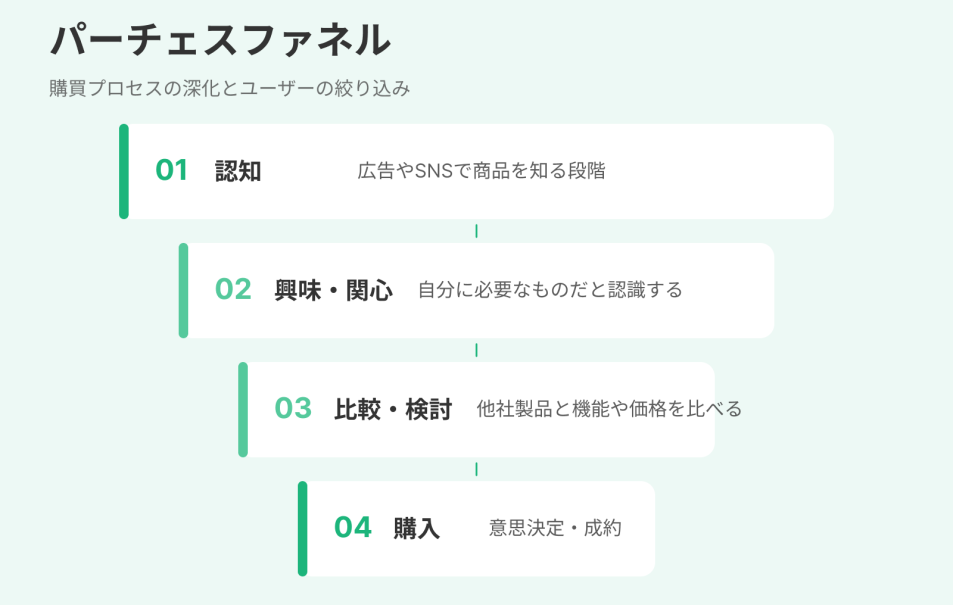パーチェスファネルはAIDMAモデルをもとに、見込み客が認知から購入に至るまでの意思決定プロセスを段階的に整理したモデルで、業種を問わず活用できる汎用性の高さが特徴です。