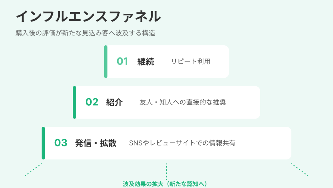 インフルエンスファネルとは、購入後の顧客行動を可視化したモデルで、顧客の評価や発信が新たな購買につながる流れを示します。