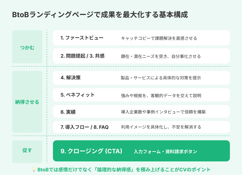 BtoBランディングページには必要な基本構成があります。ここでは、成果を上げるために必要な9つの構成要素を解説します。