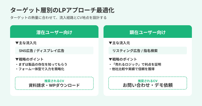 ランディングページは潜在・顕在ユーザーの2種類のターゲット層に分けられます。それぞれのターゲット層を意識して、ランディングページにおけるアプローチの方法を変えることが大切です。
