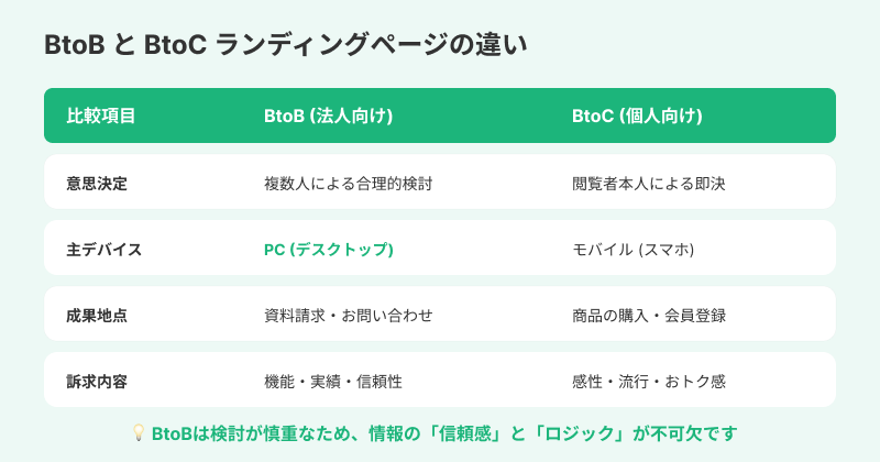 企業をターゲットにしているBtoBと、消費者をターゲットにしているBtoCではランディングページにも違いがあります。