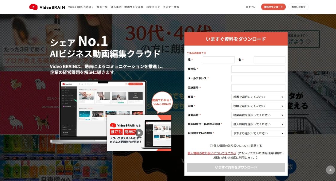 Video BRAINは自動動画ビジネスウェアの会社です。判断材料として導入企業の一覧や、選ばれる理由として製品の操作性が可視化できるよう動画を配置しています。他にも、導入のメリットやコスト・サポート体制など検討材料をしっかり掲載しているのが特徴です。