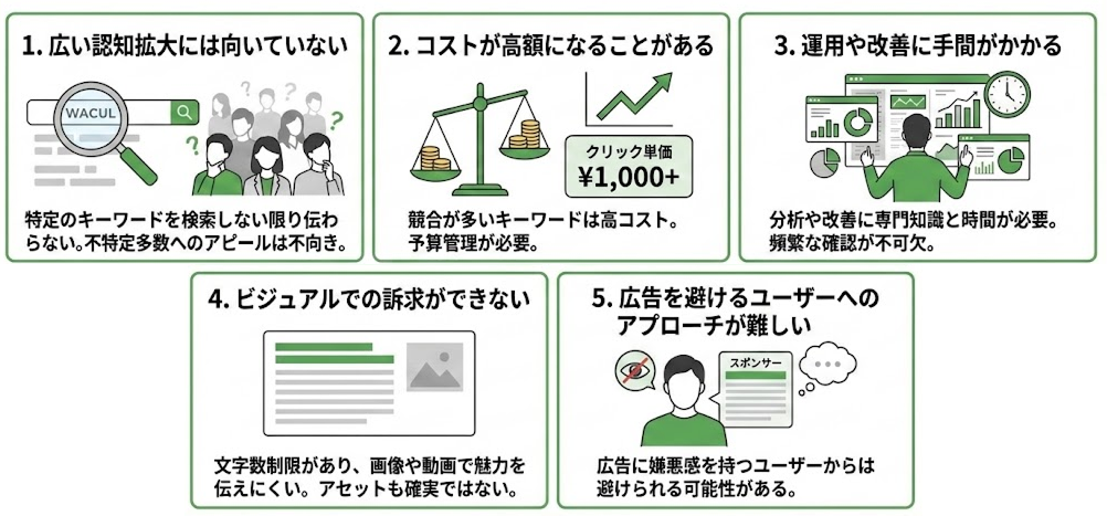 リスティング広告は、ユーザーが検索するキーワードに連動して広告が表示されます。そのため、ユーザーが特定のキーワードを検索しない限り、商品やサービスを伝えることができません。不特定多数の人に、商品やブランドイメージを広めたいときには不向きです。