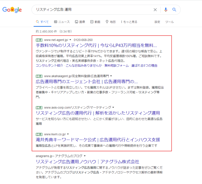 リスティング広告の入札を計画しているキーワードで、どのような広告文を掲載しているかを把握します。競争相手が多いほど、リスティング広告は検索結果に表示されにくい傾向です。競合他社の訴求内容や数、広告の質などを把握した上で、自社の予算などと照らし合わせて、入札するか判断することが重要です。