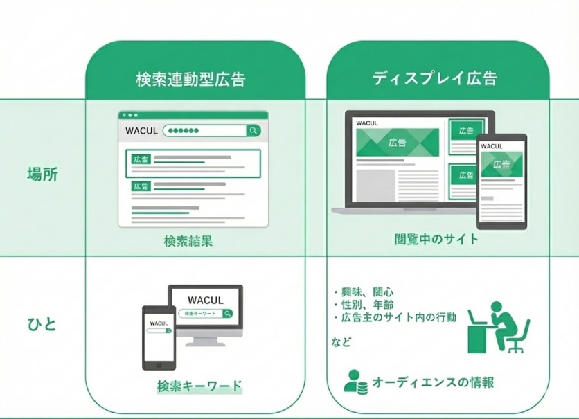 「検索連動型広告」と「コンテンツ連動型広告」があるので、以下で詳しく解説します。