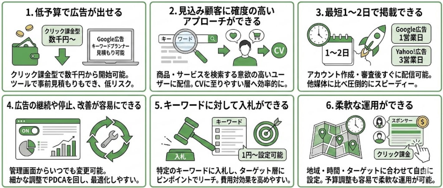 リスティング広告は、低予算で見込み顧客へ効率的にアプローチできます。広告出稿までの期間も短く、継続や停止、改善も容易です。ただし、キーワードによっては高コストになり、運用や改善にも手間がかかります。