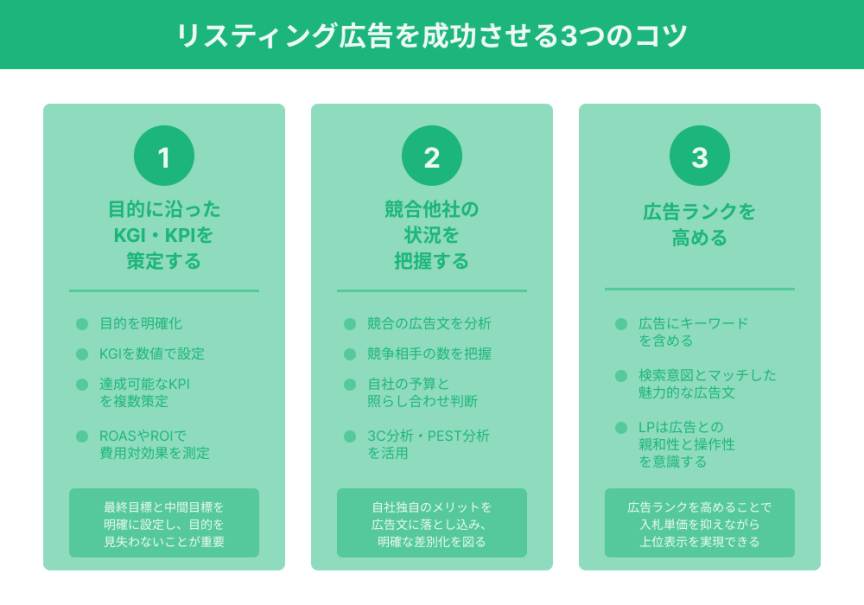 リスティング広告を成功させるには、目的に沿ったKPI・KGIの策定や競合他社の状況把握が必要です。成功させるコツを3つに分けて解説します。