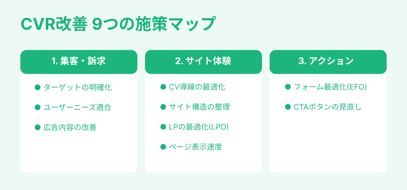 CVR改善には複数の視点が必要です。ここでは、成果につなげる具体的な9つの施策を解説します。