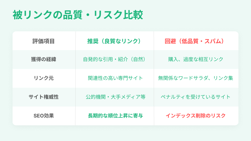 低品質なサイトからの被リンクは、SEOに悪影響を及ぼす可能性があります。以下のような特徴を持つサイトからのリンクは避けましょう。