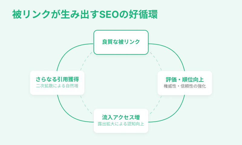 被リンクはSEOにおいて非常に重要な要素です。質の高い被リンクを獲得することで、検索結果での上位表示、ドメインパワーの向上、サイトの信頼性強化が促進されます。これらの効果は持続的であり、長期的なトラフィック増加にも貢献します。