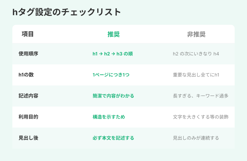 例えば、h2の説明がないままh3が出てくると、読者は内容を理解しづらくなります。このように、読み手とSEOの両方を考えるなら、順番を守る意識が大切です。