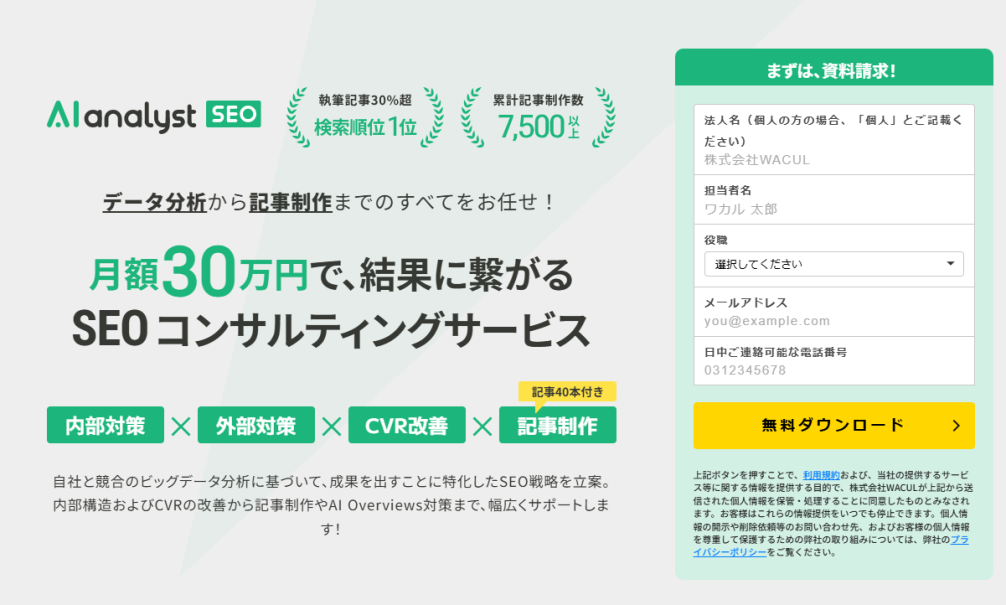株式会社WACULが提供する「SEOコンサル」は、月額30万円で戦略から実行まで一貫サポートする「SEOコンサルティング」サービスです。本サービスは、貴社サイトデータだけでなく、競合サイトや弊社が保有するビッグデータの分析に基づき、CV獲得に特化したSEO戦略を立案し、記事制作からCVR改善提案まで幅広くサポートいたします。SEOに関する情報収集をしている方や、現在のSEOにお悩みの方は、お気軽にご相談ください。