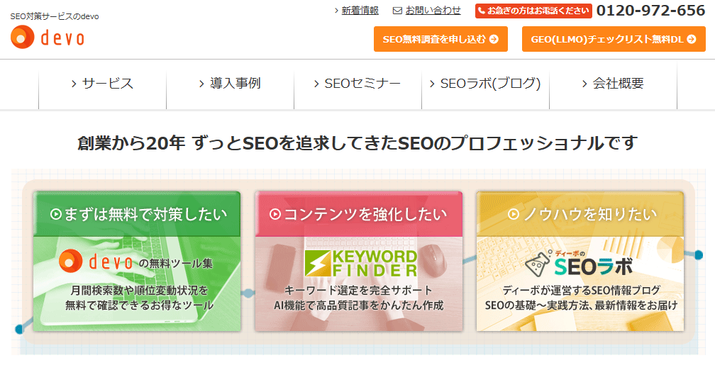 株式会社ディーボの主な業務は、自社開発によるSEO商品の提供や、SEOブログの運営などです。さらに、コンテンツSEOツール「キーワードファインダー」やSEO対策サービス「SEO Pack」、掲載順位チェックツール「BULL」などを提供しています。