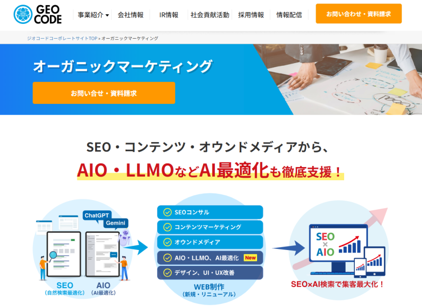 株式会社ジオコードの主な事業は、Webマーケティング事業とクラウド事業です。オーガニックマーケティング事業では、SEO対策のほか、リスティング広告、Webサイト制作のサービスを提供しています。SEO書籍の出版、SEO対策のノウハウを紹介するブログ「SEM JOURNAL」を運営しています。