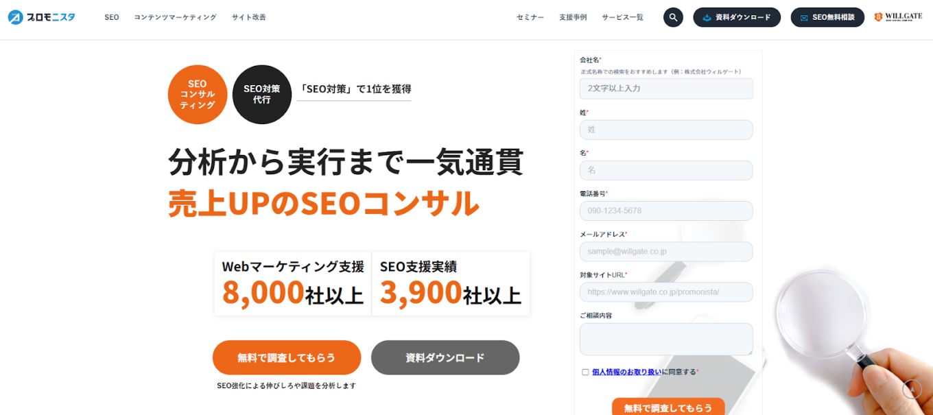 株式会社ウィルゲートは、コンサルティング事業とメディア事業を主とするSEO対策会社です。SEOコンサルが主軸のサービスや、SEOに強い記事作成サービス「サグーワークス」、分析ツール「TACT SEO」を提供しています。SEOサービスを展開するためのノウハウを集約したブログ「プロモニスタ」を別途運営し、SEO対策への知見を深めています。