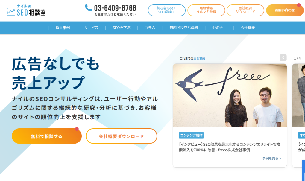 | ナイル株式会社 | SEO対策:40万円/月~ | ・支援実績2,000社以上、CV数2.6倍、セッション数9倍に | SEOコンサル:〇記事制作:〇 内製化支援:〇 | ナイルのマーケティング相談室 |