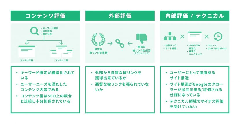 | 内部対策 | 自社のWebサイトの構造や内部リンク、ソースコードの最適化などを整備 |