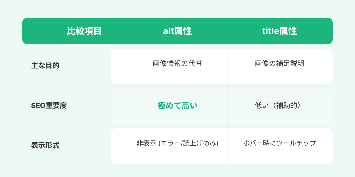 画像のalt属性とtitle属性は違いがわかりにくいですが、SEO的に重要度が高いのはalt属性です。alt属性がユーザーや検索エンジンのクローラーのためにその画像の情報を記述するのに対し、title属性はユーザーに対して画像の補足説明を行うものです。alt属性は基本的に記述すべきですが、title属性は必ずしも記述する必要はありません。