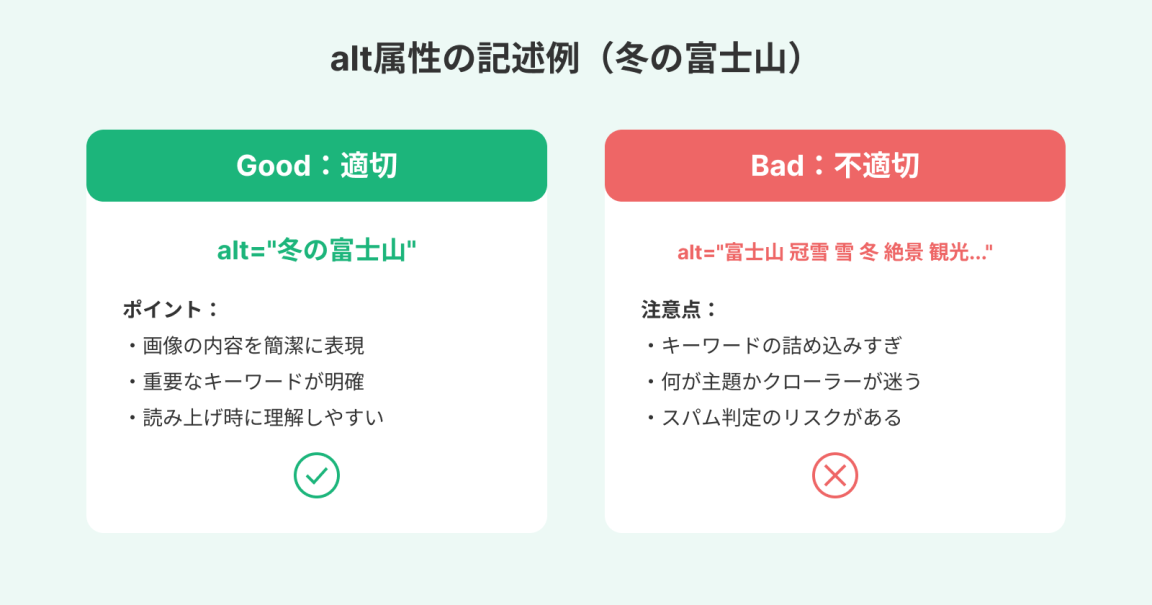 画像の内容をわかりやすく記述したいからといって、キーワードを詰め込みすぎないように注意しましょう。