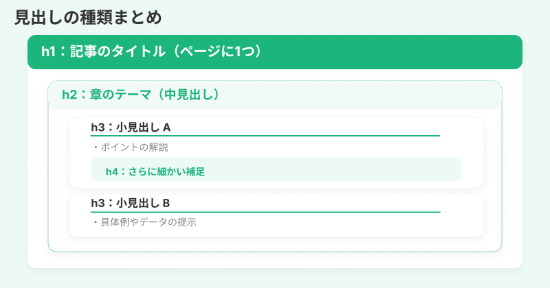 ブログに設定する見出しタグには、いくつかの種類があります。ここからは、それぞれの一般的な役割を解説します。