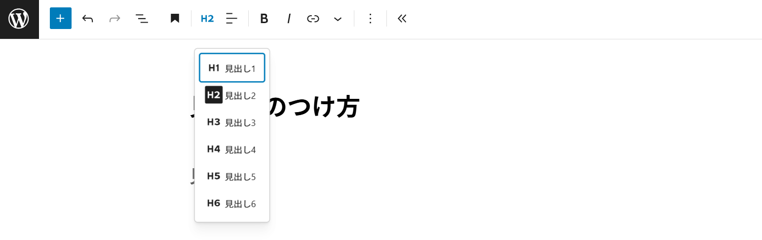 2.「H2」と書かれた部分をクリックし、見出しの種類を選択する