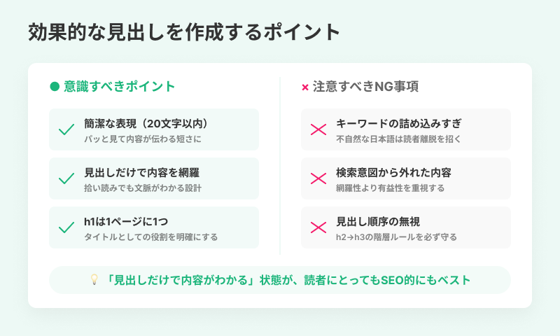 ブログの見出しを作成する際は、以下のポイントに注意しましょう。