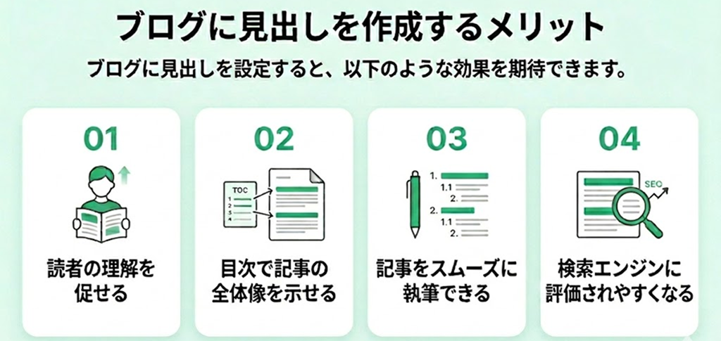 ブログに見出しを設定すると、以下のような効果を期待できます。