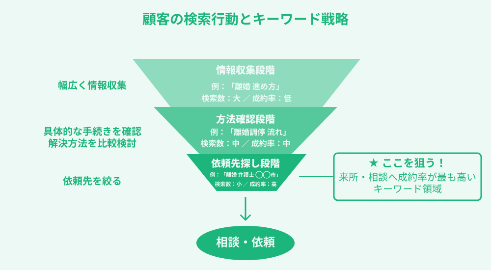 弁護士・法律事務所のSEO施策では、この最後の段階を狙うと成約率が上がります。
