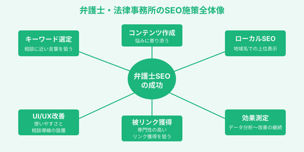 SEOはユーザーに検索から事務所の存在を知ってもらい、相談につなげるための取り組みです。キーワード選定や悩みに寄り添うコンテンツを作成しつつ、ローカル対策SEOやUI・UXの改善などの施策をバランスよく進めることで、安定した集客を期待できます。
