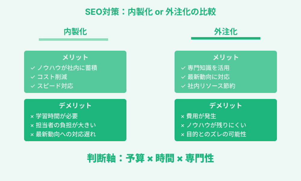 SEO対策は自社で進める方法と、専門会社に外注する方法とがあります。ここからは、内製化と外注、それぞれのメリット・デメリットを解説します。