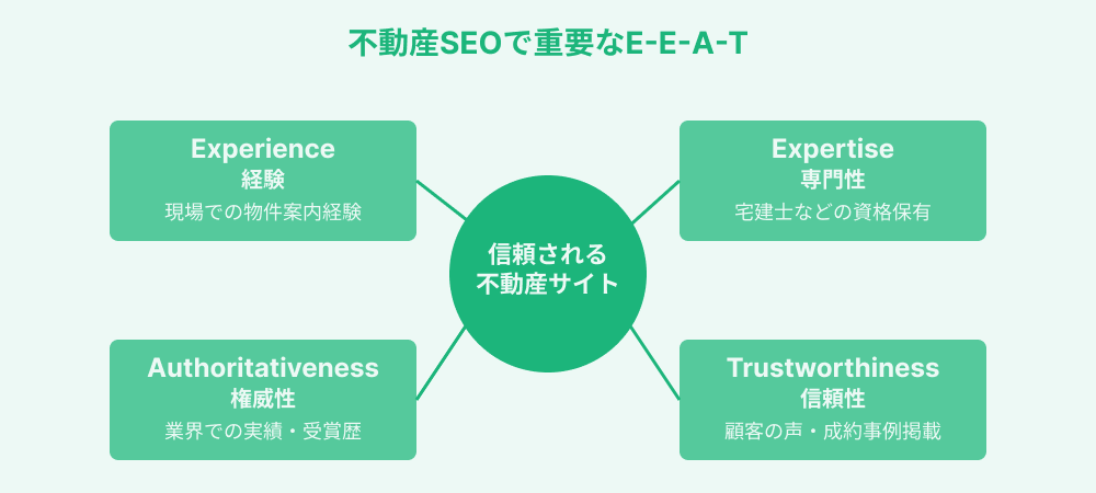不動産はお金や生活に直結するため、Googleは信頼性を重視します。E-E-A-Tを意識し、監修や実績で信頼性(Trust)を示すことが欠かせません。