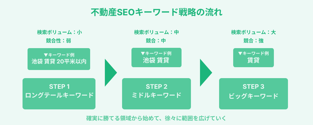 例えば「池袋 賃貸 20平米以内」「横浜 中古マンション リノベ向き」などは大手も取り切れていないことが多く、上位を狙いやすい傾向があります。