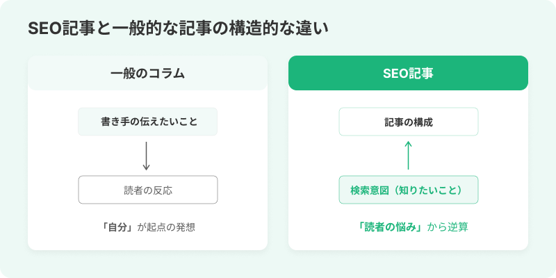 SEO記事は「検索されること」を前提に設計されています。一般的なコラムが書き手の伝えたい内容を中心に構成されるのに対し、SEO記事は読者が検索窓に入力した言葉から逆算して作られます。その理由は、検索キーワードに合わなければ上位に表示されないためです。