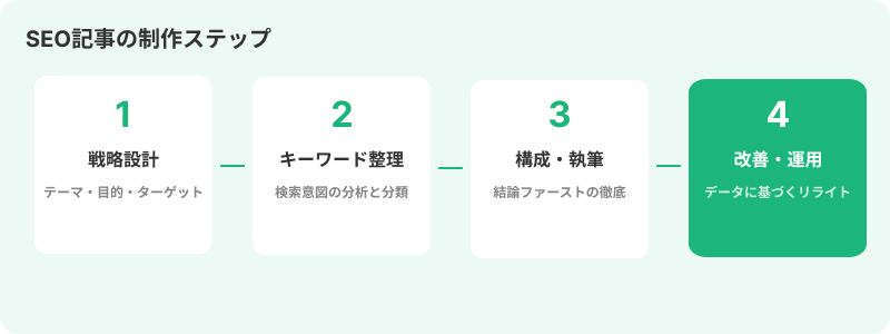 SEO記事は計画的に進めることが重要です。思いつきで書き始めると、方向性がぶれてしまいます。ここからは4つの工程に分けて説明します。
