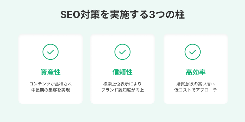 SEO対策のメリットは、長い目で見て安定した集客につながる点です。ここでは、なぜ多くの企業がSEOに取り組むのか、その理由を順番に整理していきます。