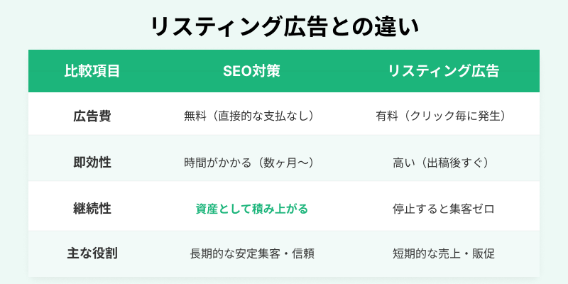 リスティング広告との違いは、お金を払うかどうかと、効果が続く期間にあります。まず結論からいうと、SEOは広告費を直接支払わなくても集客できる方法です。一方、リスティング広告は、検索結果の上に表示するために費用を支払います。