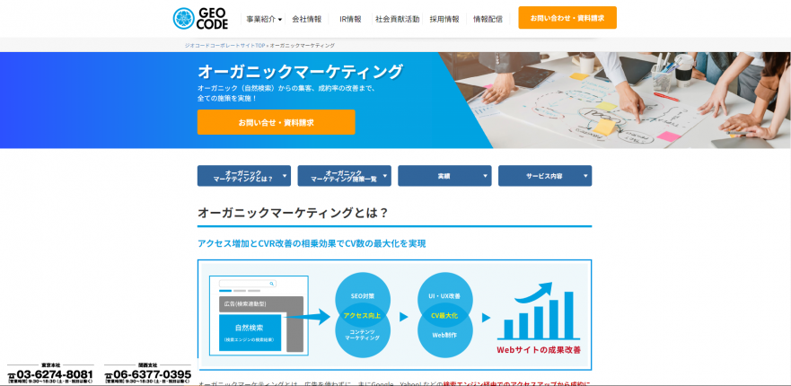 株式会社ジオコードは、SEO戦略の企画・実行を専門としており、Webサイトの検索順位向上を支援します。キーワード分析やコンテンツ最適化、外部リンク戦略など幅広い施策が特徴です。