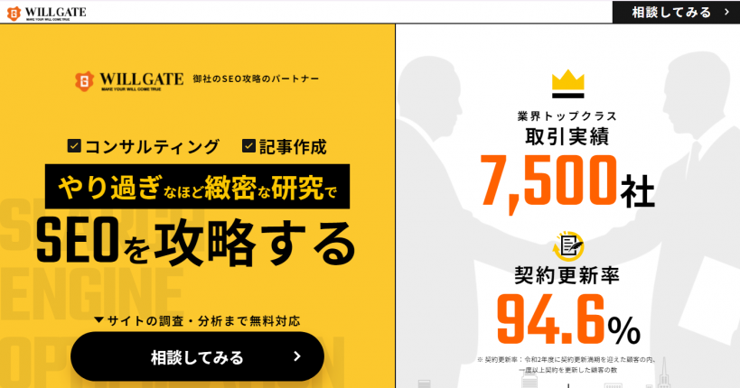 株式会社ウィルゲートは、SEOを中心としたデジタルマーケティング戦略の提案から実行まで行います。Webサイトの最適化、コンテンツ戦略の策定、リンク構築などが主なサービス内容です。
