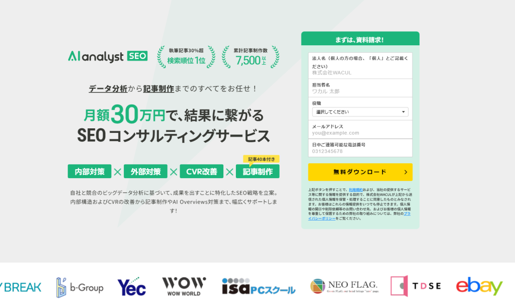 | 株式会社WACUL | SEOコンサル:30万円/月~ | 記事のセッション数を20から 約4万まで上昇 | SEOコンサル:〇記事制作:〇 内製化支援:〇 | 「AIアナリスト」ブログ |