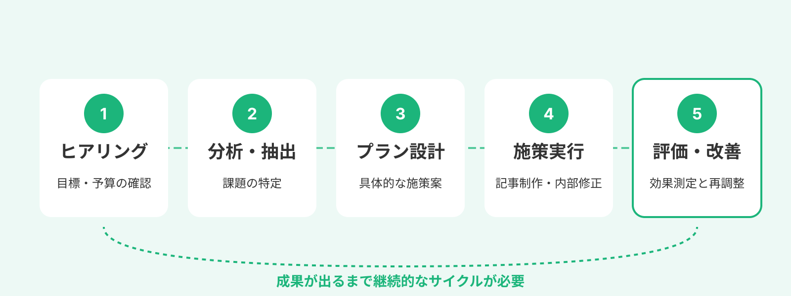 以下は、SEOコンサルティングの一般的な流れです。課題や希望によって異なることがあります。