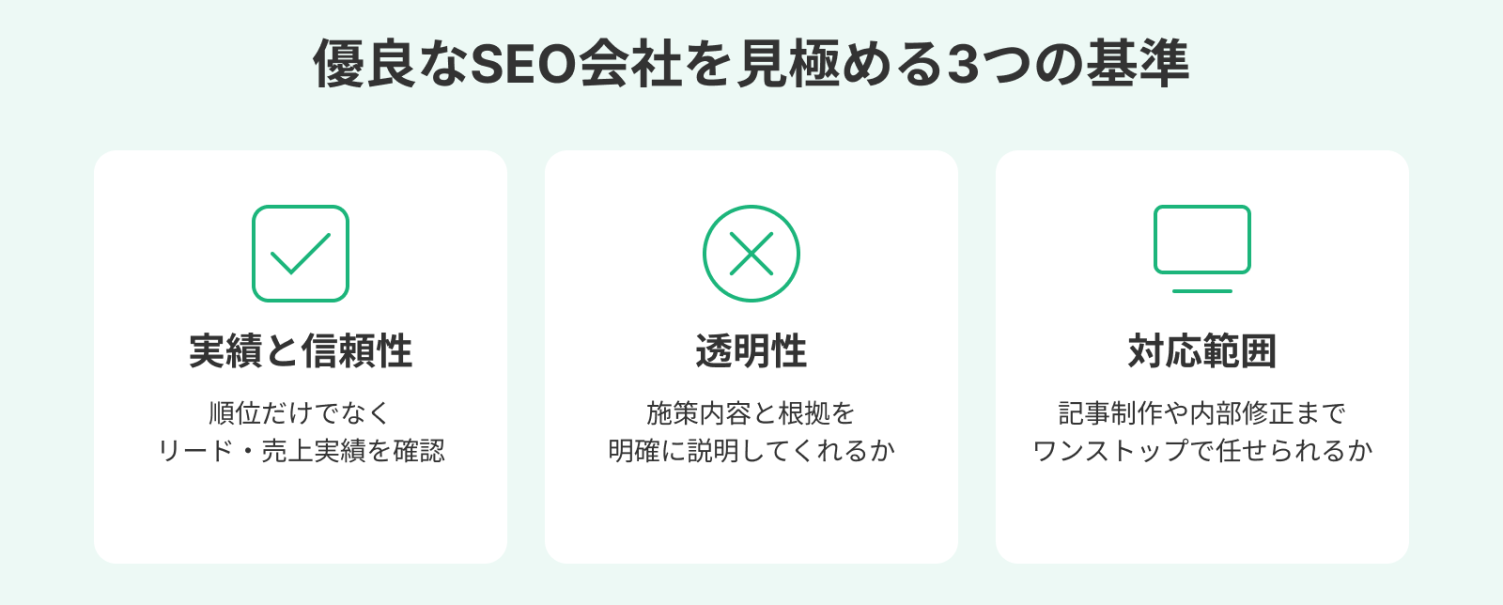 会社選びが、質の高いSEOコンサルティングにつながります。ここでは、選ぶ際に押さえておきたい3つのポイントを解説します。