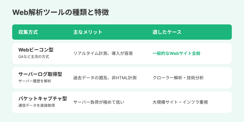 解析タグを挿入するだけで、簡単にデータを収集できて、ほぼリアルタイムで状況を把握できるのがメリットです。ただし、解析タグが貼り付けられていないページのデータは把握できません。