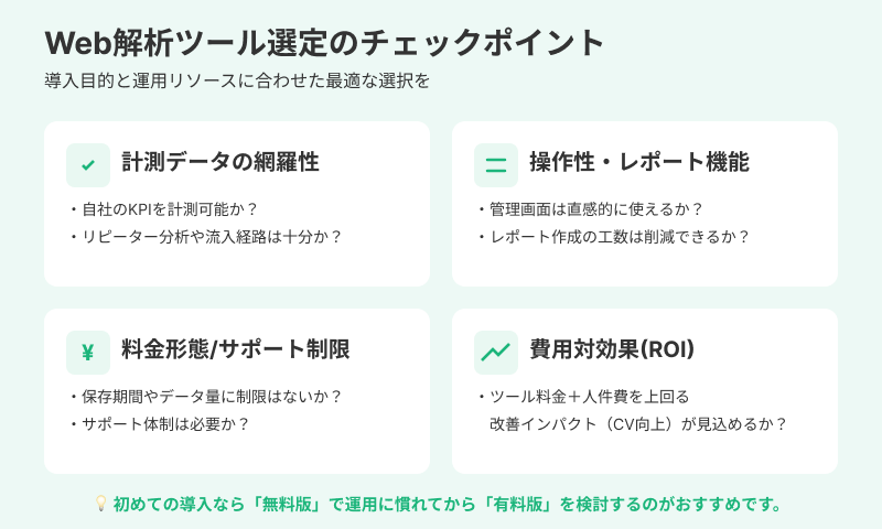 Web解析ツールを選ぶ際には、サイトの規模や目的を考慮することが重要です。無料版は初期投資を抑えて基本機能を試せるため、初心者や小規模サイトに適しています。ただし、データ保存期間やサポートに制限がある点に注意が必要です。一方、有料版は高度な分析やレポートの自動化、手厚いサポートが魅力であるものの、相応のコストが発生します。