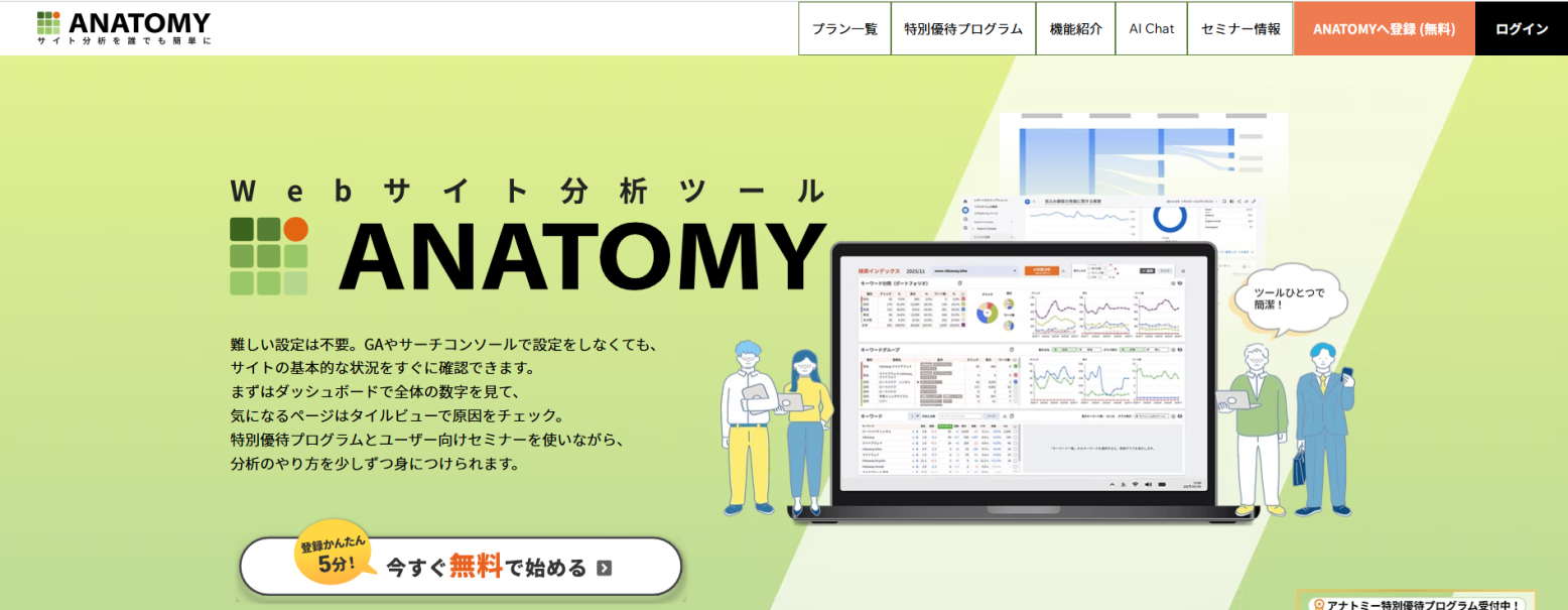 「AIアナリスト」は、AIがアクセス解析を⾃動で⾏って、重要な改善ポイントを教えてくれるツールです。12,000サイト以上を改善したノウハウで、Webサイトの膨大なデータを分析し、成果を伸ばすための改善ポイントをデータ根拠とともに届けます。Googleアナリティクスに連携するだけで利用可能で、設定は2分で終わります。まずは無料版からお試しください。