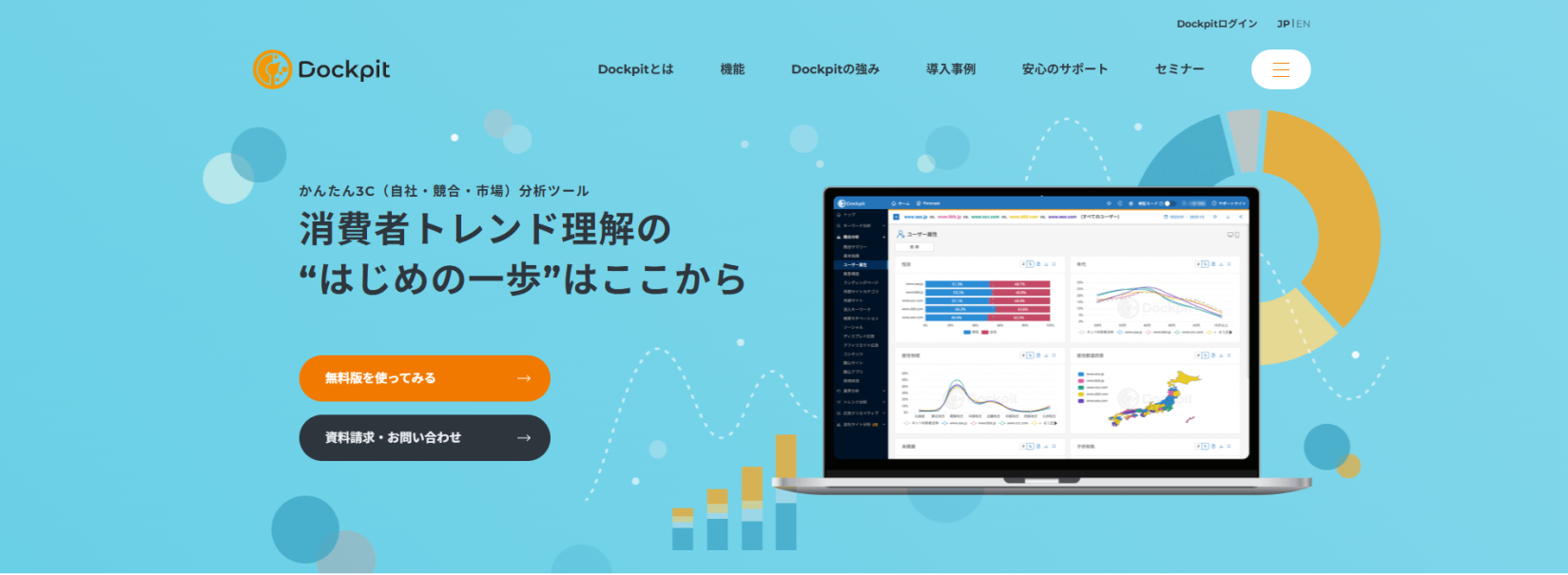 Dockpitは株式会社ヴァリューズ が提供する、競合のリサーチツールです。膨大なWeb行動ログデータを活用して、自社サイトの解析、競合の流入経路や検索キーワード、ユーザー属性を可視化できるのが最大の特徴です。直感的なUIで、誰でも数分で精緻なレポートを作成できます。Googleアナリティクスとの連携機能もあり、実測データとパネルデータを組み合わせた分析も可能です。