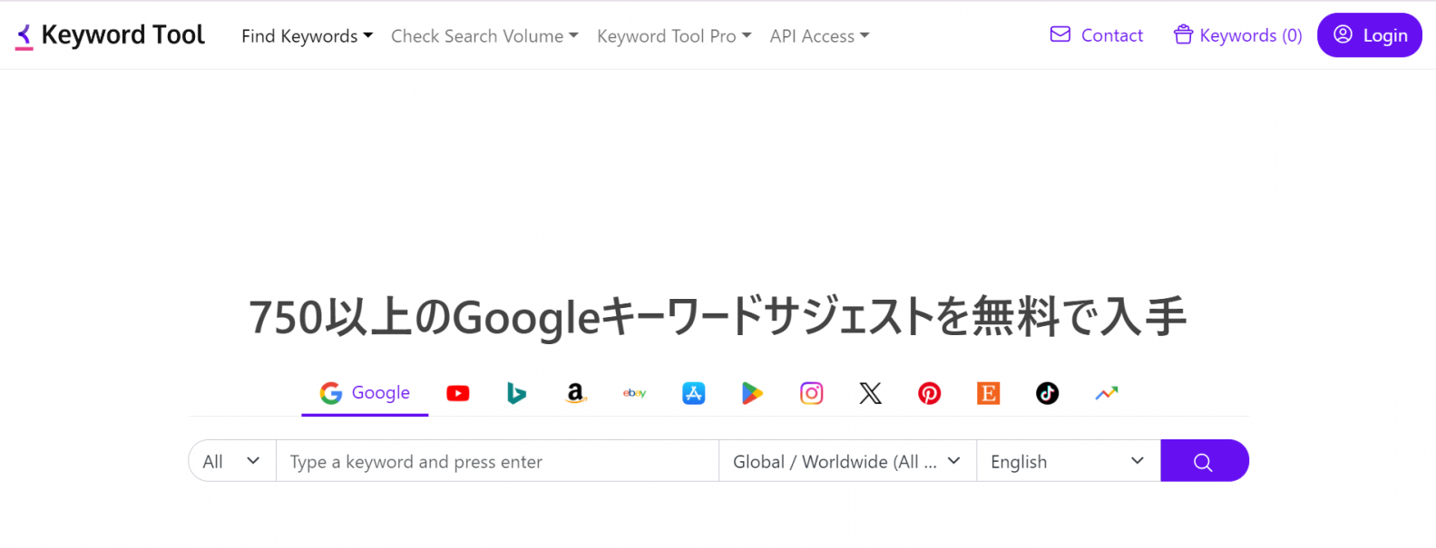 無料で使える、海外製のサジェストキーワード取得ツールです。サジェストキーワードとは、検索した際に予測表示されるキーワードで、ツールにより多くのキーワードを取得できます。Keyword Toolはたくさんのキーワードが抽出できる点が魅力です。ただし、検索ボリュームを調べたい場合は、有料プランへの移行が必要です。
